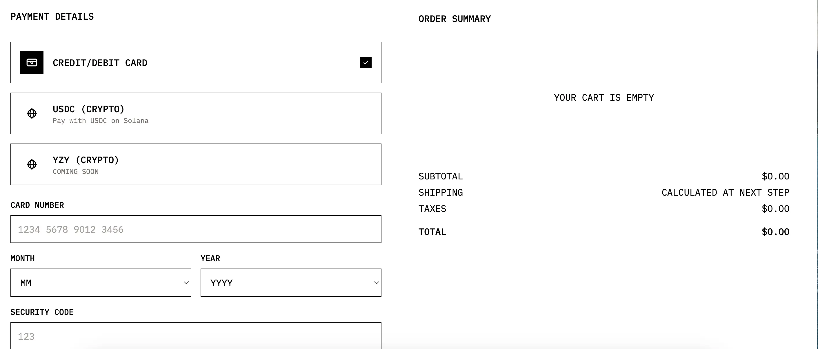 YZY Card是可以在全球使用YZY和USDC的借记卡,用户可以通过任何非托管钱包中的法定货币或加密货币进行充值,支持YZY、USDC、USDT等资产。另外,Kanye还支持用户使用USDC或YZY(即将上线)进行旗下Yeezy品牌服饰购买。