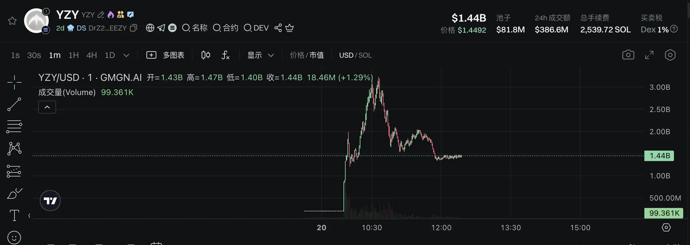 明星效应叠加精心策划,YZY热度被迅速点燃。GMGN行情显示,YZY市值一度突破34亿美元,现已跌破10亿美元,日内成交额超3.8亿美元,其手续费收入已超过2500枚SOL。