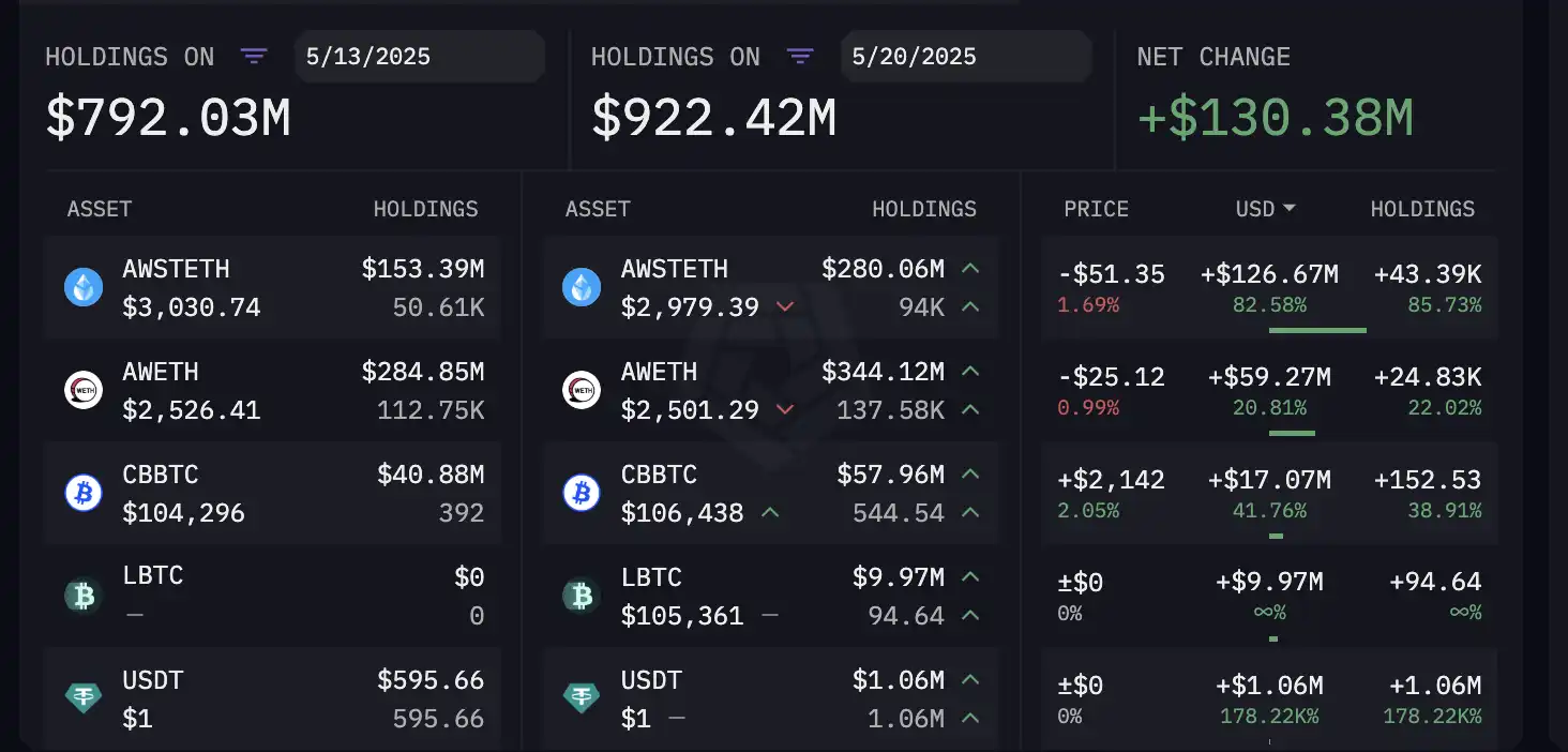 From the perspective of capital growth, since mid-February 2025, the scale of the institution's assets has significantly accelerated, and it once broke through the $1 billion threshold. In just the past week (May 13–20), its net assets increased by over $130 million, mainly due to a significant increase in the AwSTETH (Aave v3 wstETH) position, with an added value exceeding $120 million.