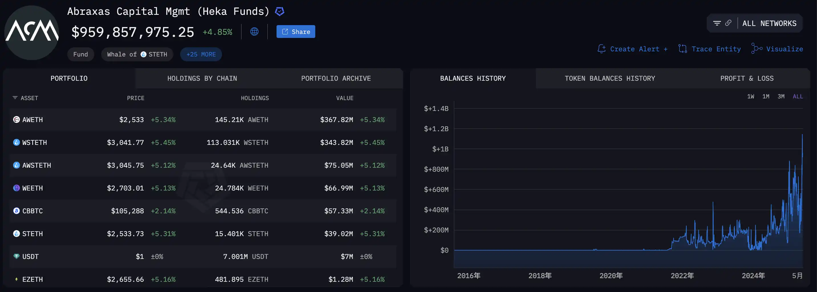 According to Arkham data, as of May 20, the total value of crypto assets held by two related public addresses of Abraxas Capital exceeded $1.15 billion, with cumulative profits of approximately $280 million.