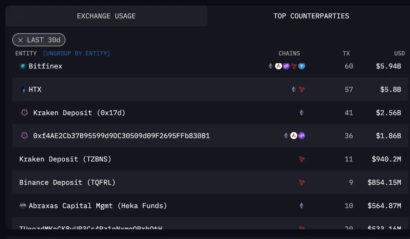 Through continuous trading and cooperation, Heka Funds gradually became one of Tether's largest institutional clients, and it can be said that Heka Funds was also a driving force behind Tether's rapid development. According to a report published by Protos in 2021, Heka Funds received over $1.5 billion in USDT at that time, accounting for approximately 1.5% of Tether's total issuance. That year, Heka Funds accumulated approximately $52 million in profits, far exceeding the $5.8 million profit made by its parent company Abraxas, becoming one of the most successful funds within the group. In the past 30 days, Arkham data shows that among Tether's main trading counterparts, Heka Funds' transaction amount reached $564 million, ranking eighth.