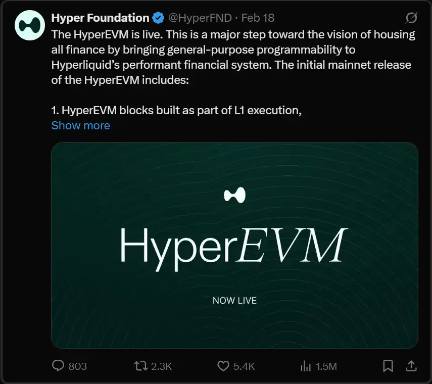 All of Hyperliquid's products, from perpetual contracts to spot trading, are built on its custom blockchain - Hyperliquid Layer1. On February 18, 2025, HyperEVM officially went live on the mainnet.