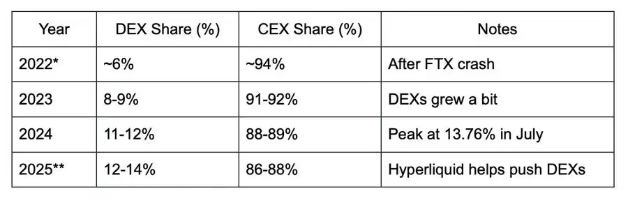 After the FTX collapse in November to December 2022. 2025 data is a projection as of March 6. Hyperliquid recognized this shortcoming: if the user experience is poor or liquidity is insufficient, users will not migrate to the chain in large numbers. Therefore, the team is committed to building "CEX-level speed and liquidity, but completely on-chain."