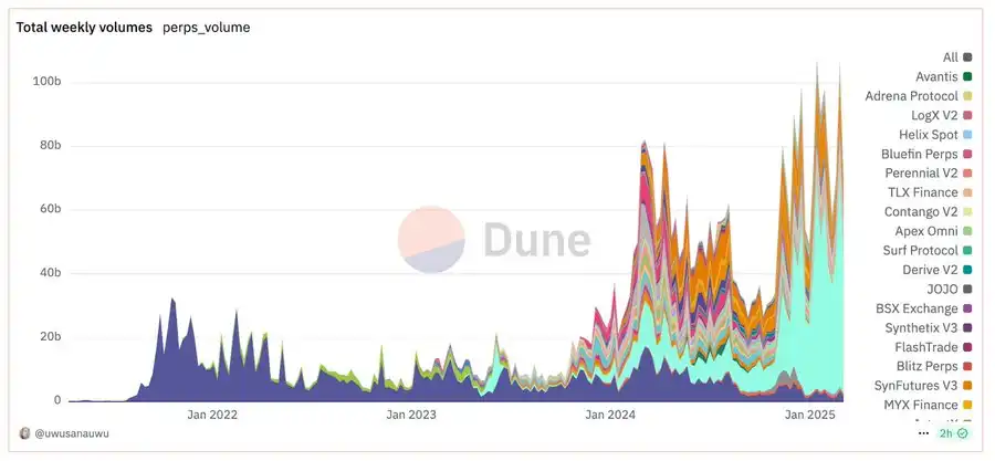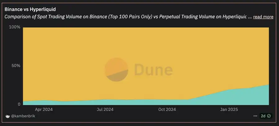 · Although Hyperliquid is still smaller than top CEXs like Binance, it has narrowed the gap in some months. By March 2025, its trading volume accounted for over 26% of the total trading volume shown (compared to Binance's top 100 spot trading pairs). This comparison highlights how a high-performance on-chain perpetual contract exchange can effectively challenge and even dominate the centralized spot market.