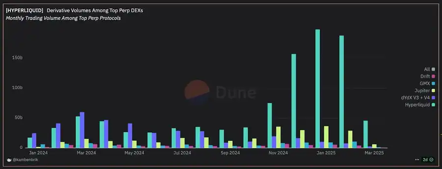 As of February 2024, Hyperliquid had captured 56% of the on-chain derivative DEX trading volume. Since July 2024, its monthly perpetual contract trading volume has surpassed its main competitors. In January 2025, Hyperliquid's single-month perpetual trading volume reached $196 billion, while the total of the other four protocols was only $60 billion.