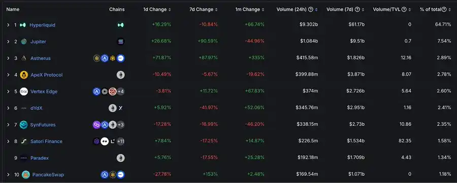 Data shows that within 24 hours, the total trading volume of on-chain perpetual contracts was $14.37 billion, while @HyperliquidX accounted for an astonishing $9.3 billion, a staggering 64.71% share, demonstrating Hyperliquid's absolute dominance in the market.