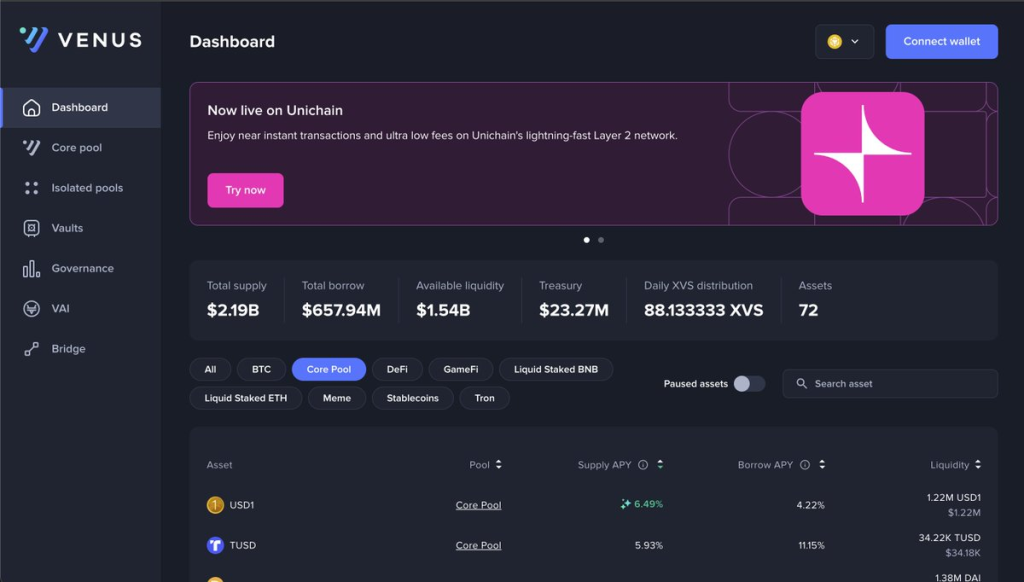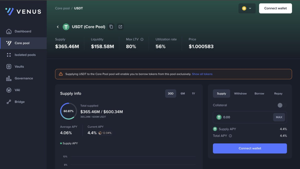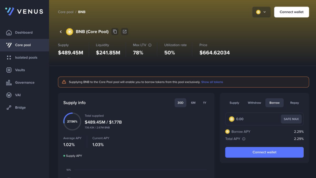 During Binance TGE, if worried about BNB price drop, borrowing coins from exchange may be either exhausted or with high interest rates. At this time, you can go to the on-chain lending platform Venus to borrow coins by collateralizing.