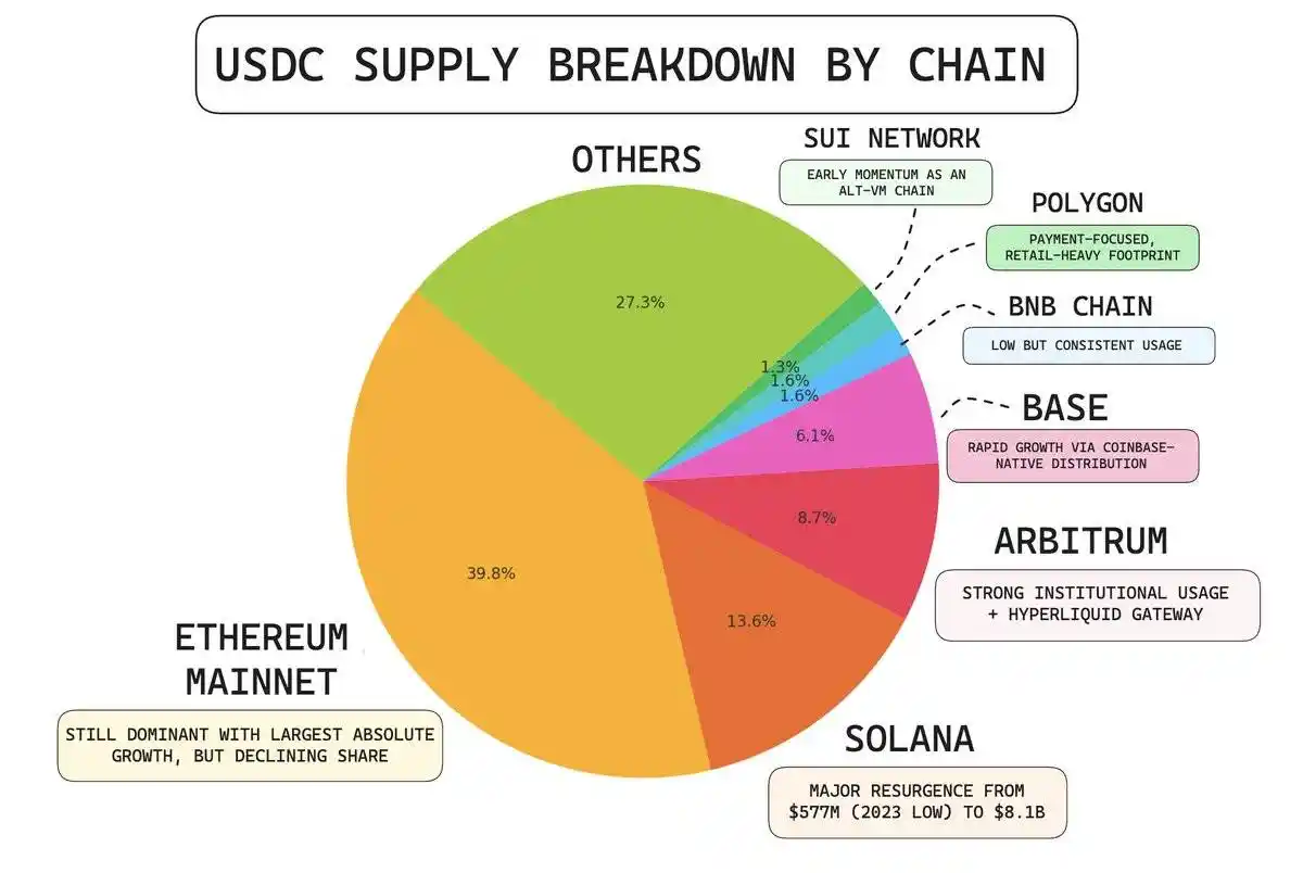 USDC supply is migrating from Ethereum to Layer2 and Alt-VM chains such as Solana and Arbitrum:
