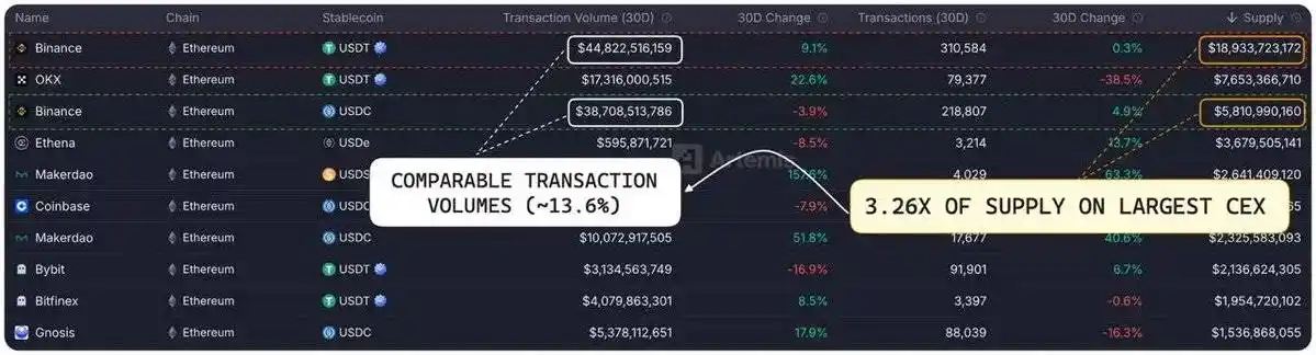 Although USDC supply (5.81 billion) is only one-third of USDT (18.9 billion), its 30-day trading volume reached 38.7 billion (only 13.6% behind USDT). Calculating the velocity of funds (trading volume / supply volume) shows: