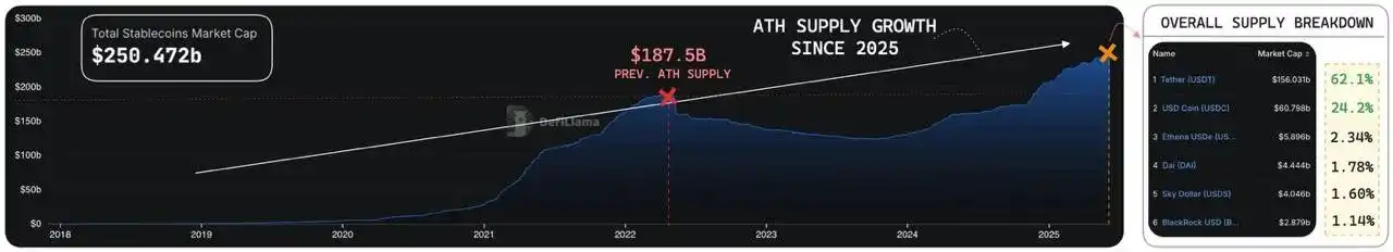 The total supply of stablecoins reached $251 billion, with USDT (62.1%) and USDC (24.2%) accounting for 86% combined. USDC growth is driven by three forces: