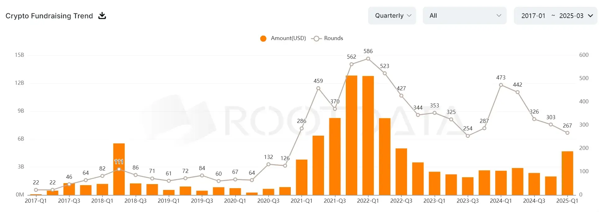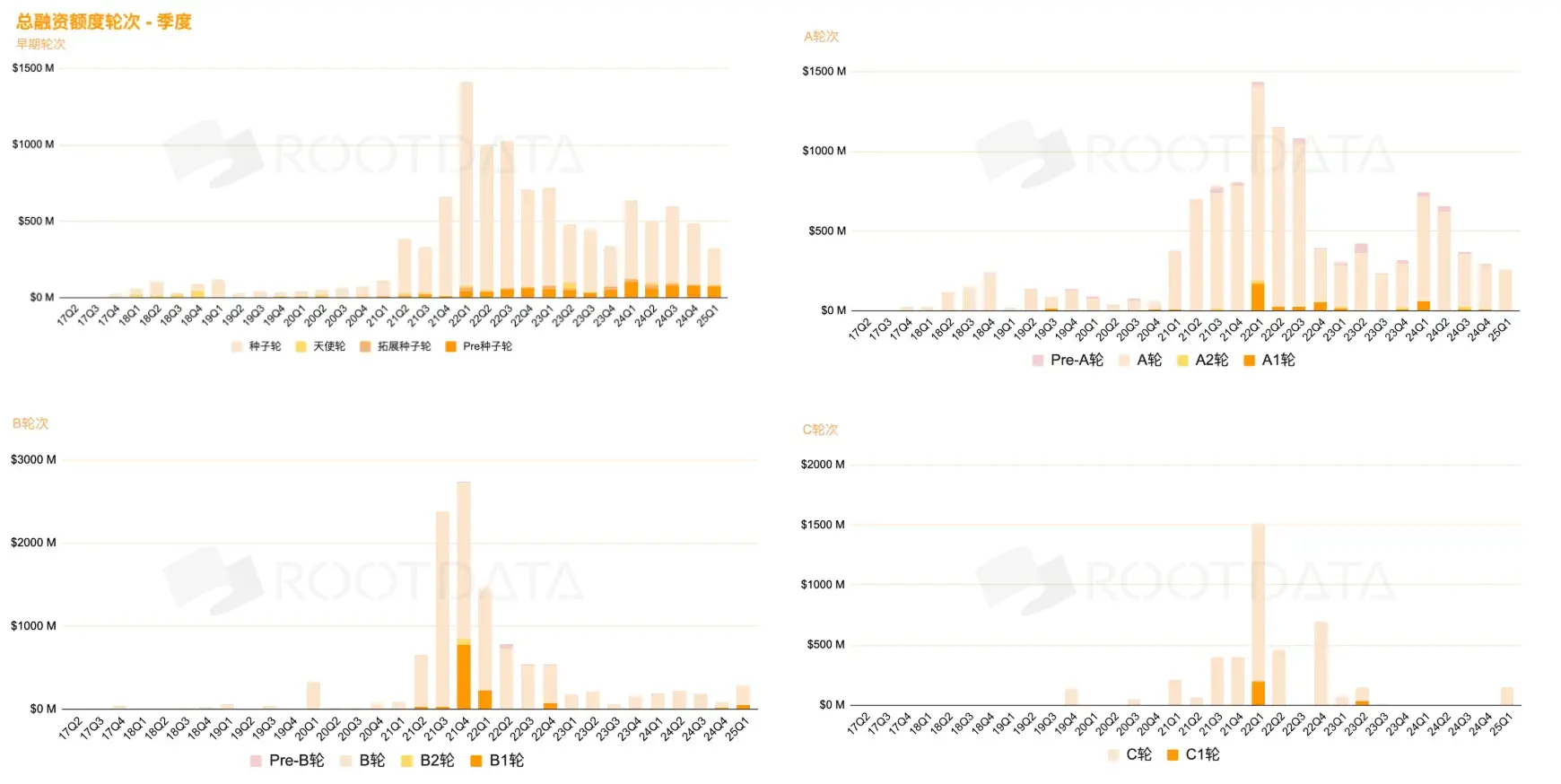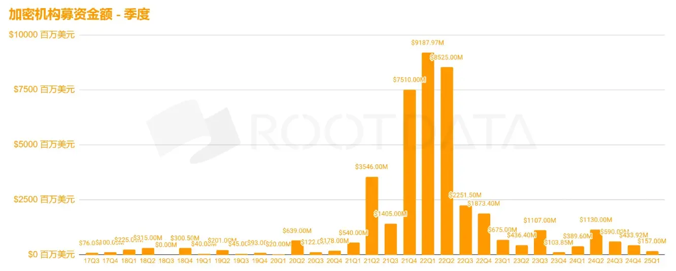 RootData data shows that later-stage crypto financing amounts have contracted significantly. The bubble of the 2021 cycle led to overvaluation, and currently, project valuations are being drained even in the A-round or seed round. No institutional investors were willing to publicly invest in C-rounds from Q3 2023 to Q4 2024. Strategic financing remains stable, while M&A and OTC transactions show that institutional funds, in a market with insufficient liquidity, are more willing to conclude off-the-record agreements.