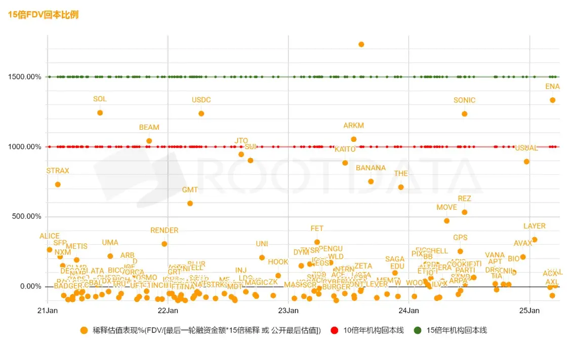 c. In the newly issued tokens in 2024, more than half of the FDV is below five times the last round of financing, directly leading to:
