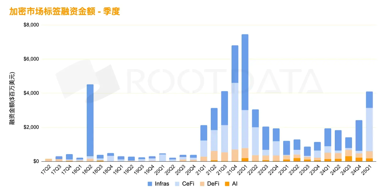 Q1 2025 data shows that while the crypto community remains engrossed in the myth of AI MEMES, eagerly imitating the first AI chatbot ELIZA in history, becoming the decentralized ELIZA in crypto history. Institutional investment in the crypto field has shown a clear division: the share of CEX and custodial projects fell from 90% at the peak after the DeFi summer and FTX collapse to 45%, while AI, DeFi, and infrastructure projects saw a counter-trend increase, accounting for 58% of the total funding during that period.