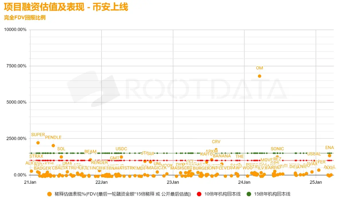 In this cycle, the crypto community is popular with the slogan of "token listing immediately shorting," which indirectly reflects the negative reaction and rejection of independent investors towards institutional projects. According to RootData, the performance of institutional tokens listed on Binance and the final financing of projects under the "3+1" unlocking rules, institutional investors face strict exit pressures: