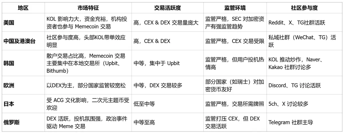 Memecoin development across different regions is shaped by culture, regulation, and market preferences, leading to substantial differences in market features: