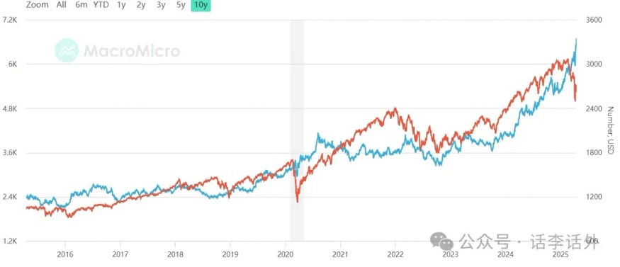 If we make a simple comparison between the historical performance of gold and the S&P 500, we can see that since 2020, the performance of the US stock market and gold has already started to show significant differences. As shown in the figure below (the blue line represents gold, and the red line represents S&P500).