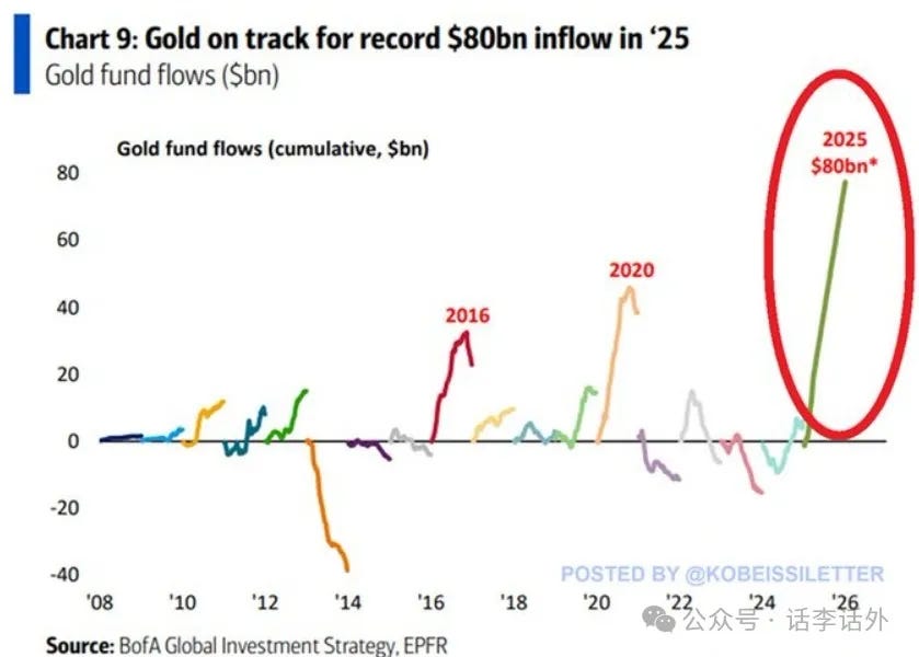 According to data from The Kobeissi Letter, the net inflow into gold funds this year has reached a record of $80 billion, which is twice as high as the previous high in 2020. Investors are injecting funds into the gold market at a record pace for risk aversion (and some funds may be for short-term speculation). As shown in the figure below.