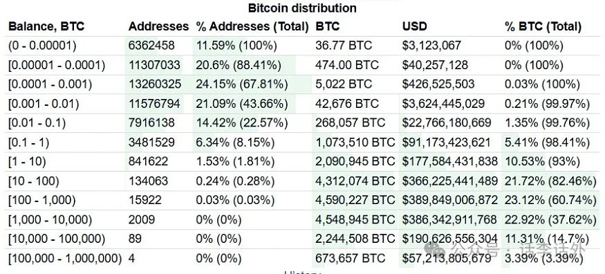 The main holders of Bitcoin are countries, whales, and investment institutions (as the U.S. and other countries' national strategic reserve plans develop, Bitcoin may become increasingly concentrated in the hands of countries and investment institutions). However, many retail investors also hold Bitcoin, as shown in the figure below.