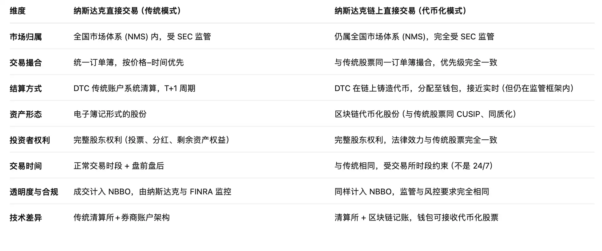 Tokenized stocks are not a new asset that appears out of nowhere, but rather a new "packaging form" of traditional equity. Its key lies in how to integrate the accounting and settlement capabilities of blockchain into the existing financial infrastructure. In Nasdaq's rule proposal submitted to the SEC, this logic is clearly articulated: In the future, investors can choose the "tokenized settlement" option when placing orders in the system, and the trade matching will still be completed in the same order book, without obtaining any additional priority due to tokenization. The real change occurs after the transaction—Nasdaq will send the settlement instructions to the Depository Trust Company (DTC), which will transfer the traditional stocks into a dedicated account and mint equivalent tokens on the chain, then distribute them to the brokers' wallets. This way, tokenized stocks maintain complete consistency with traditional stocks in the trading phase, only introducing a chain-based mapping at the settlement layer.