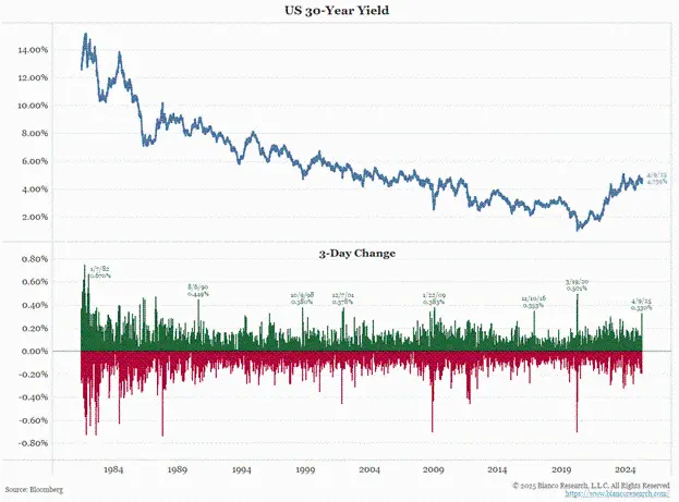 Bianco Research's bottom panel shows the abnormality of the three-day change in the 30-year bond yield. The degree of change caused by the tariff incident is comparable to market volatility during the 2020 pandemic, the 2008 global financial crisis, and the 1998 Asian financial crisis. This is definitely not good news