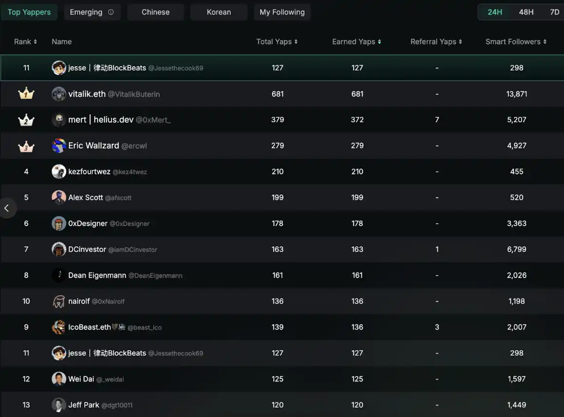 From the actual results, accounts that rank high on the Yap leaderboard are often not the ones with the most followers, but more likely the ones recognized by top KOLs. As a report states, Kaito does not rely on traditional metrics like follower count or page views, but places the focus of rewards on the "smart followers" reputation weight — even if you have dozens of thousands of followers, but your content has no real value, you may still get very few Yap points. This "quality over quantity" evaluation method corrects the drawbacks of purely chasing traffic to some extent, injecting a touch of academic "peer review" into InfoFi information distribution: only content that receives expert endorsements can stand out.