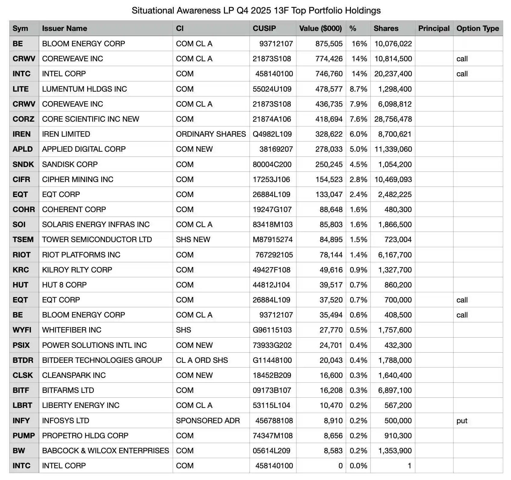 根据 Situational Awareness LP 所披露的 13F 文件(SEC 对资管规模超 1 亿美元的基金所要求的季度披露文件),2024 年 Q4 之时,Situational Awareness LP 的公开持仓总价值还「仅」有 2.55 亿美元,而在今年 2 月 16 日刚公布的 2025 年 Q4 持仓披露中,该数字已增长到了夸张的 55 亿美元。
