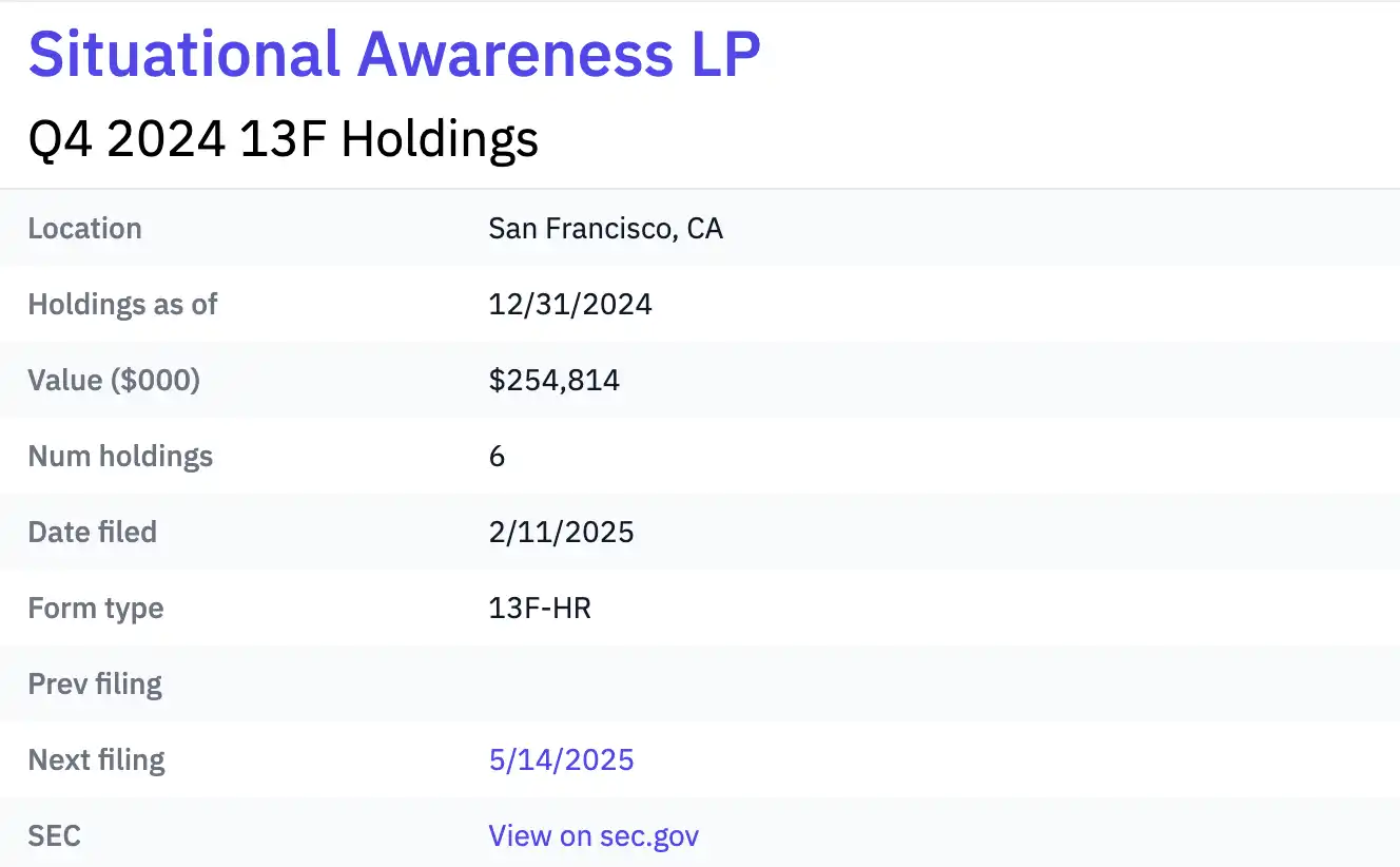 这是当下 AI 投资圈内最火的名字之一——24 岁的他,所创立的 Situational Awareness LP 基金在 2024 年 Q4 的公开持仓规模还「仅」有 2.25 亿美元,而在上个月公布的 2025 年 Q4 持仓披露中,这一数字已飞速增长到了 55 亿美元。