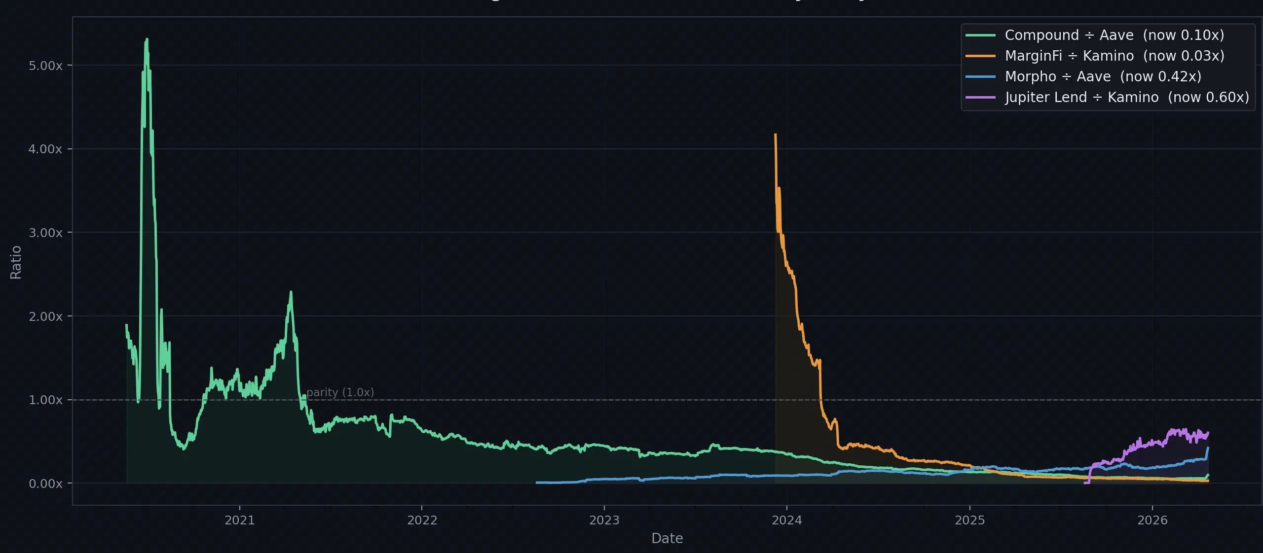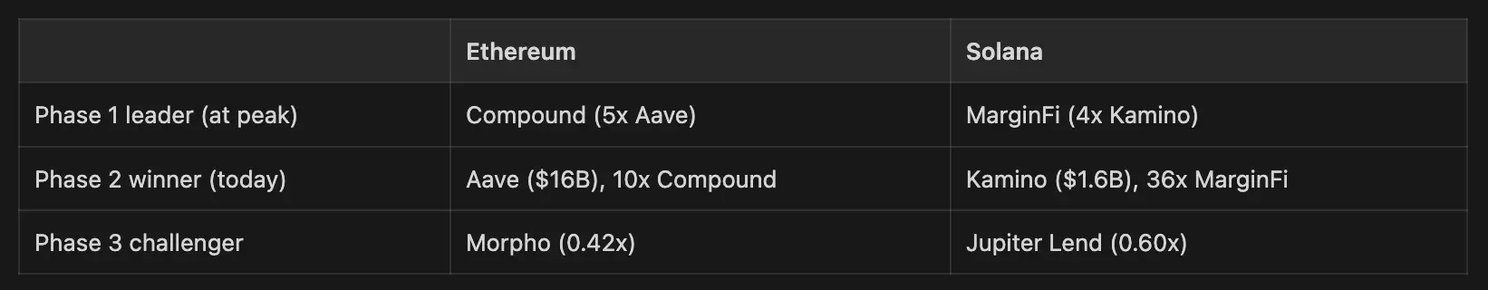现有霸主的根基真的很稳。Compound 和 MarginFi 都是自我毁灭的:Compound 败于治理迟缓和创始人出走,MarginFi 败于空投承诺未兑现。