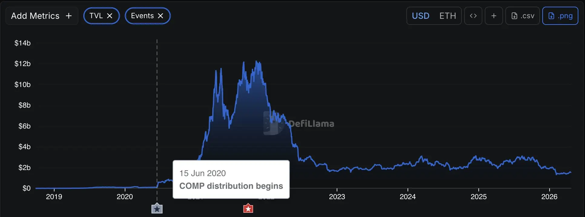 信任的损伤其实更早——2021 年 9 月,一个治理漏洞导致约 9000 万美元的 COMP 被超额分发,这类事件用户往往记很久。最后的致命一击是 2023 年,创始人 Robert Leshner 公开宣布将重心转向 Superstate,核心团队在心态上已放弃了这个协议。