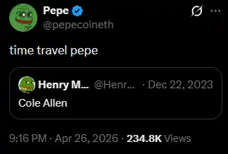这也吸引到了 ETH 主网上的 $PEPE 官方前来互动。由于他的头像是一只悲伤蛙,$PEPE 官推称他为「时间旅行悲伤蛙」。