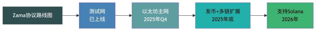 Zama现已上线公共测试网,预计将于 2025 年第四季度启动以太坊主网,初期仅支持经官方批准的应用接入,并在年底发行 $ZAMA 代币,同时扩展至更多 EVM 链,开放无许可 DApp 部署。2026 年,Zama 将进一步支持 Solana。