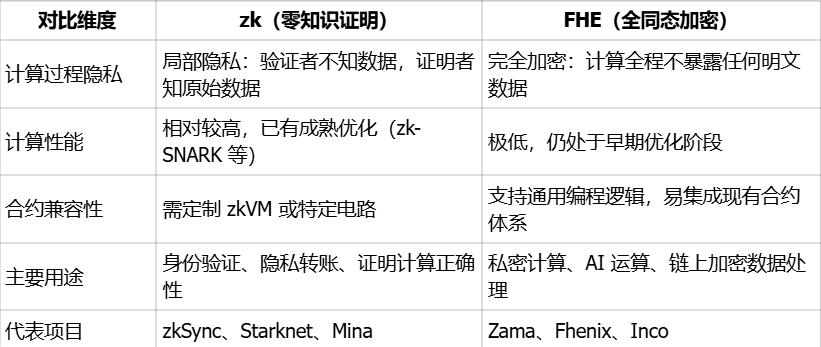零知识证明(zk)技术已广泛应用于“验证不暴露”的链上场景,而 FHE 更进一步,不仅保护数据隐私,还支持通用计算逻辑。FHE 可以在不解密原始数据的前提下完成复杂操作,为智能合约赋予真正的“加密执行”能力。