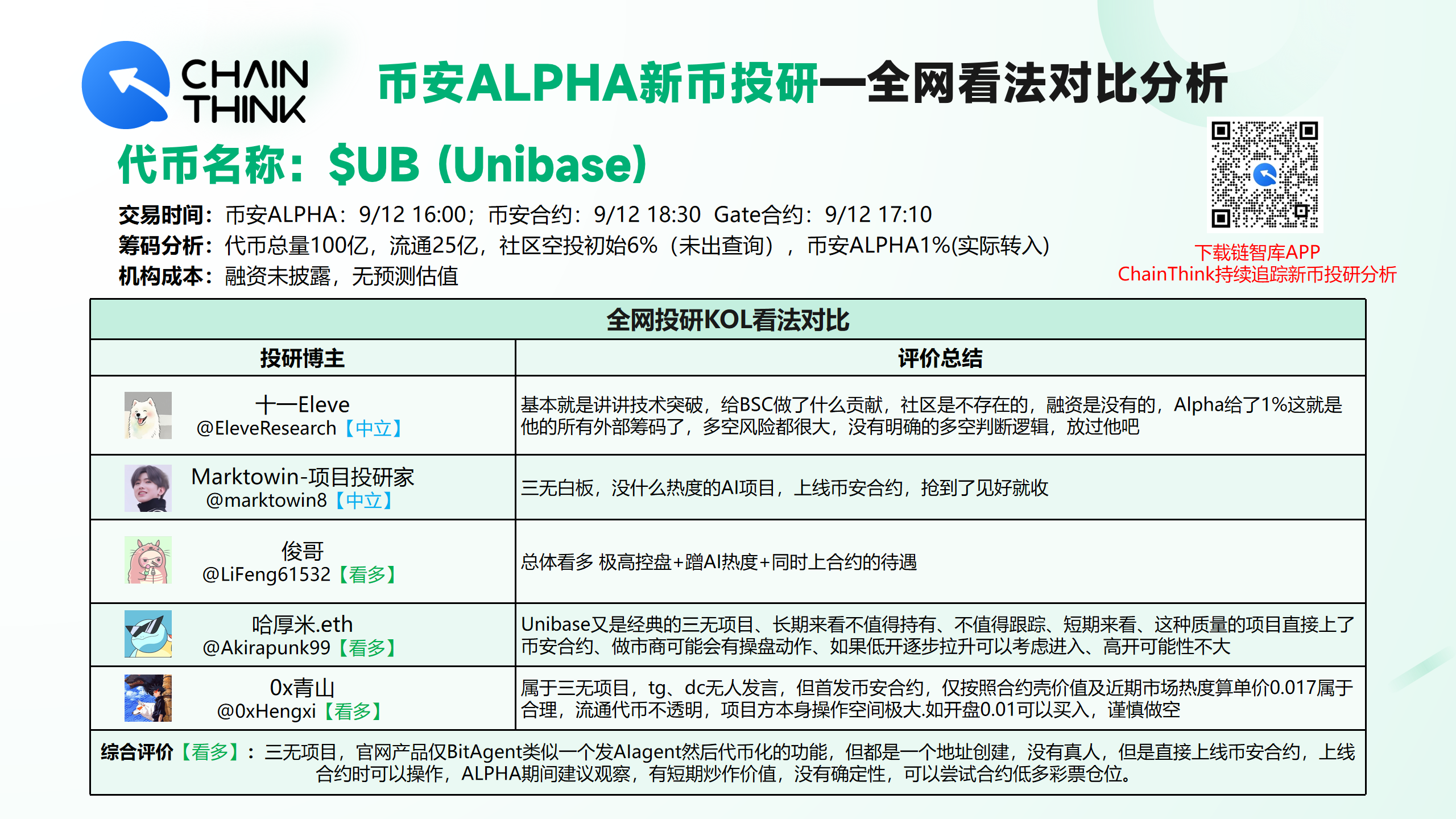 本次项目上线币安合约,币安Alpha交易时间为 16:00(UTC+8),币安合约交易时间为18:30,GATE合约交易时间为17:10,社区空投未公布,本次项目热度一般,属于AI记忆层赛道,信息不透明,下面我们将具体分析$UB (Unibase):