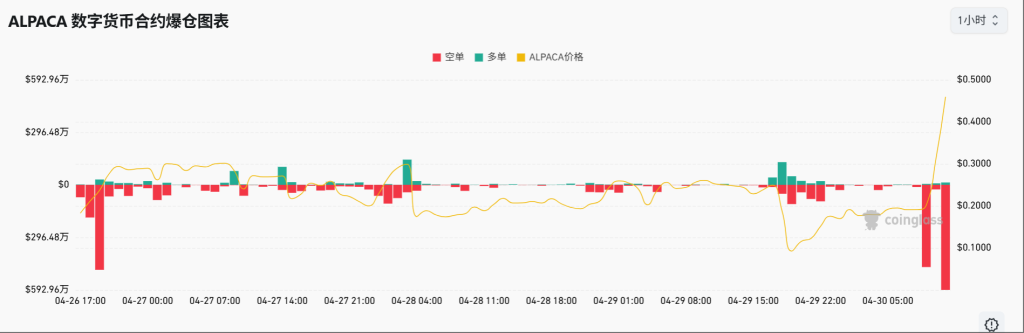币安下架消息引发散户恐慌,空单蜂拥而入。主力趁机在 0.03 美元附近建仓,随后暴力拉盘,触发空头爆仓。4 月 26 日,ALPACA 爆仓量竟超过比特币,空单占比达 90%。