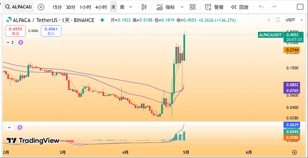 4 月 24 日,币安公告将于 5 月 2 日下架 ALPACA,按常理这本该是 "死亡宣判"。但诡异的是,ALPACA 价格在暴跌 30% 后突然绝地反击:从 0.029 美元狂飙至 0.3477 美元,涨幅超 1100%!单日交易量突破 5800 万美元,远超其 730 万美元的市值,宛如一场荒诞的单机游戏。昨日至今又开始新一轮暴涨,截至发稿单日10倍;