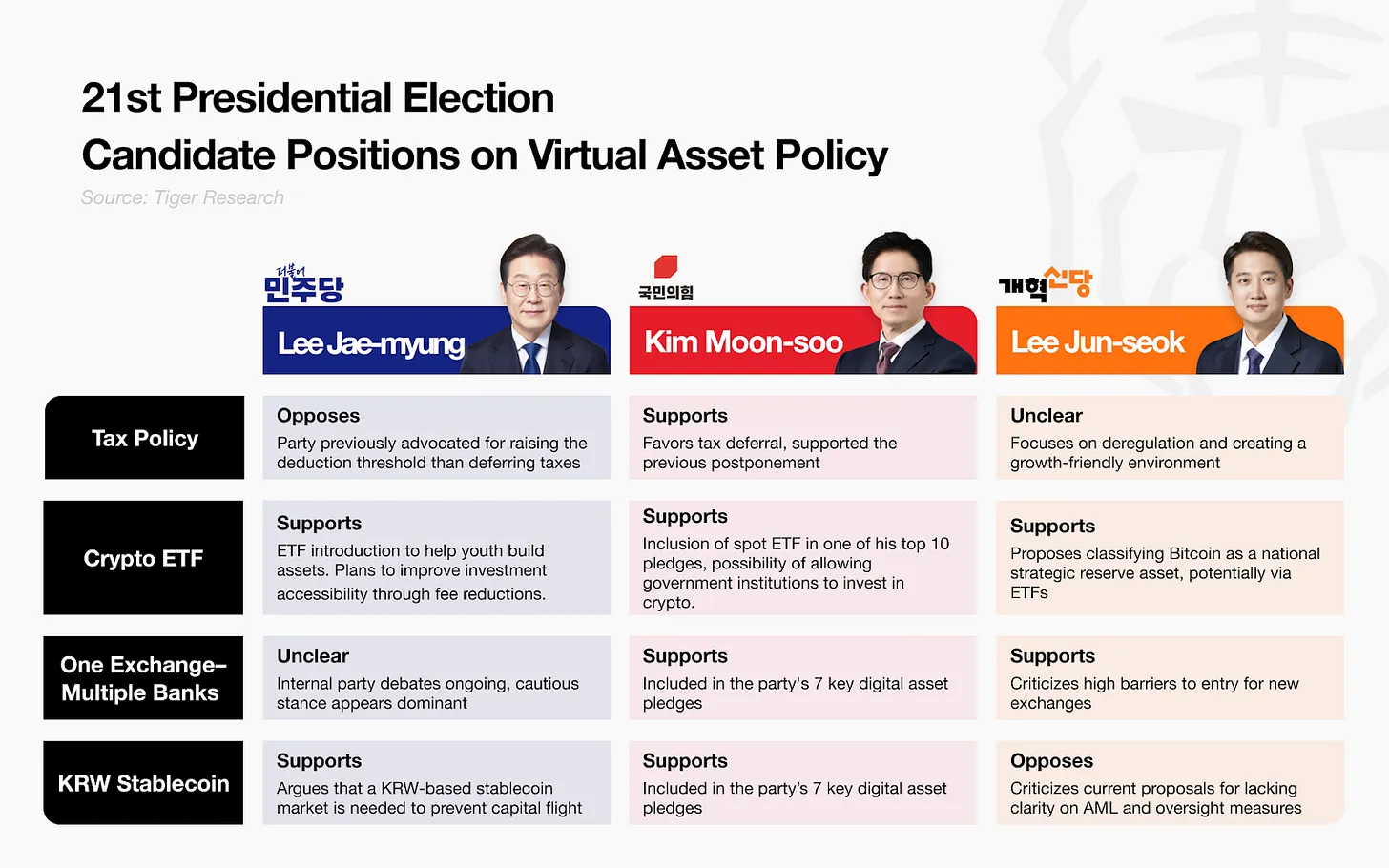• 金武星(国民力量党): 4月27日,他表达了允许公共机构投资加密货币市场的开放态度。他的十项核心政策承诺包括在“中产阶级财富扩张”的旗帜下引入现货加密货币ETF。