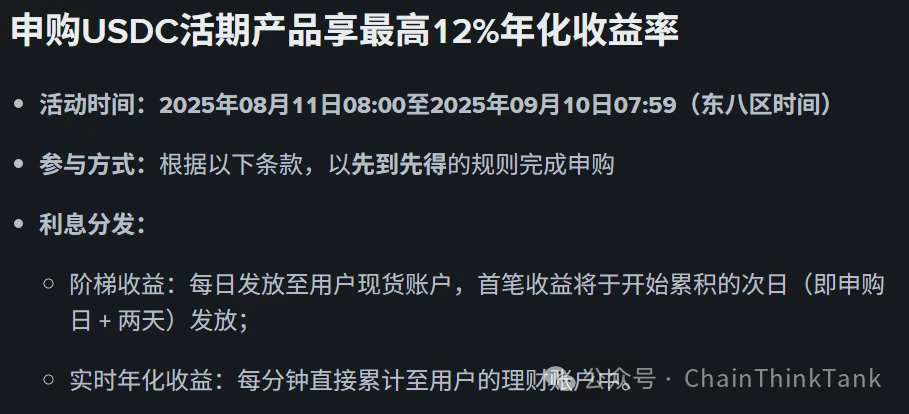 At the same time today, another piece of news has gone viral. Binance Exchange has launched a special campaign for the USDC principal-guaranteed coin earning flexible deposit product. According to its announcement, this campaign lasts for one month with a tiered yield structure. Users with up to 100,000 USD can enjoy an annualized interest rate of up to 12%.