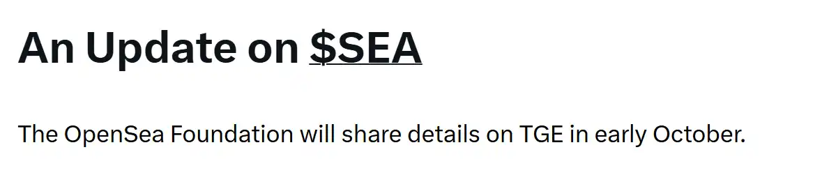 9 月 9 日,OpenSea CMO Adam Hollander 于发表在 Twitter 上的文章中透露,OpenSea 基金会将在 10 月初发布 TGE 的具体细节。