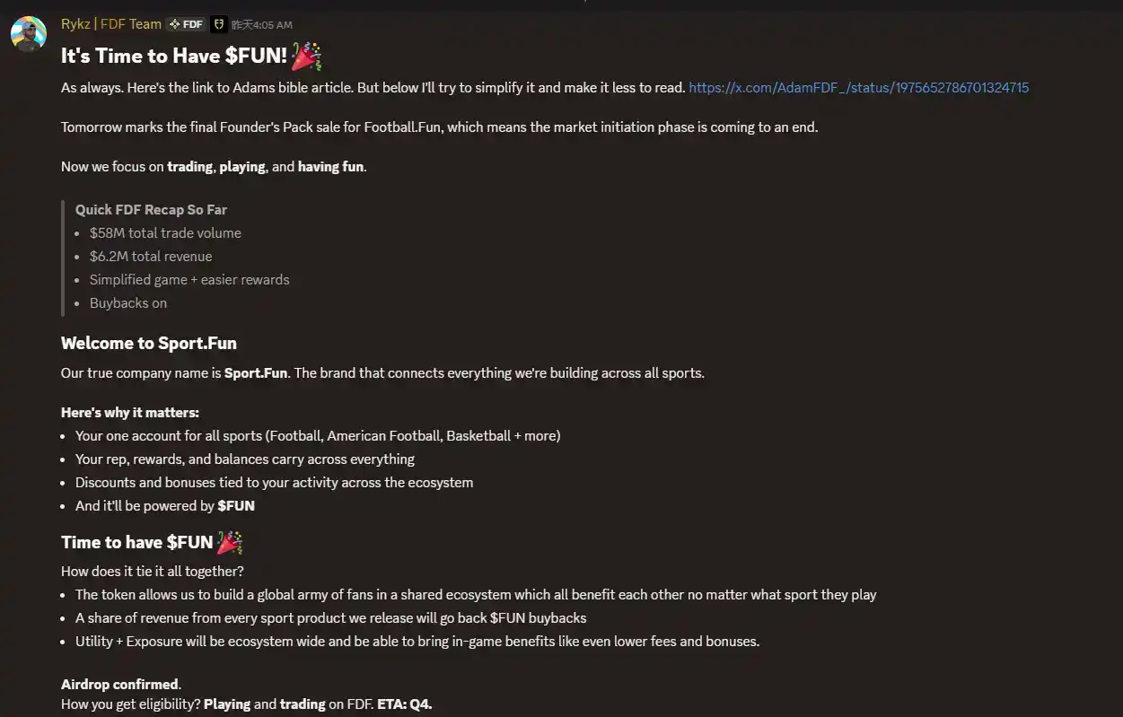 10 月 9 日,据 Base 链上体育预测应用 Football.Fun 官方消息,其母公司 Sport.Fun 将于 Q4 推出代币 $FUN 并预计将在 Q4 进行空投,该代币将享受公司旗下预测市场收益分成。